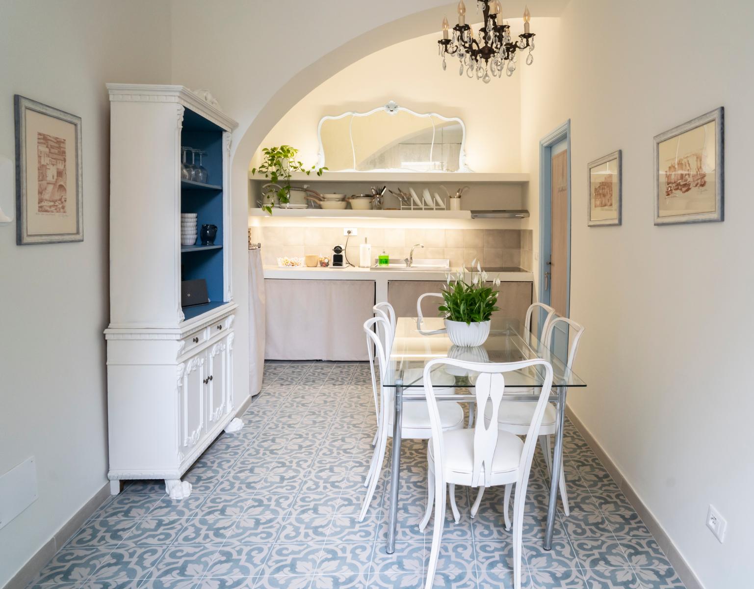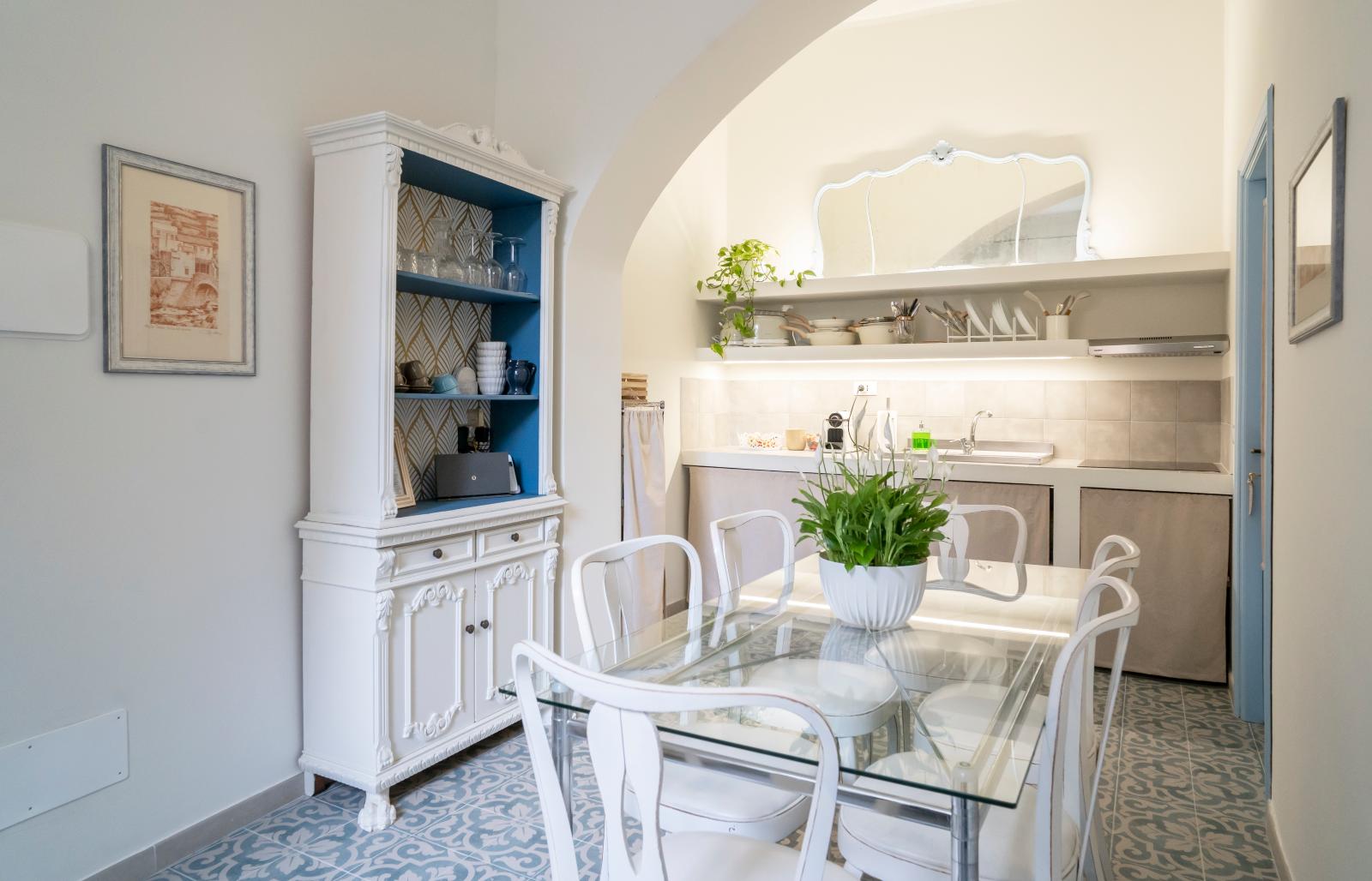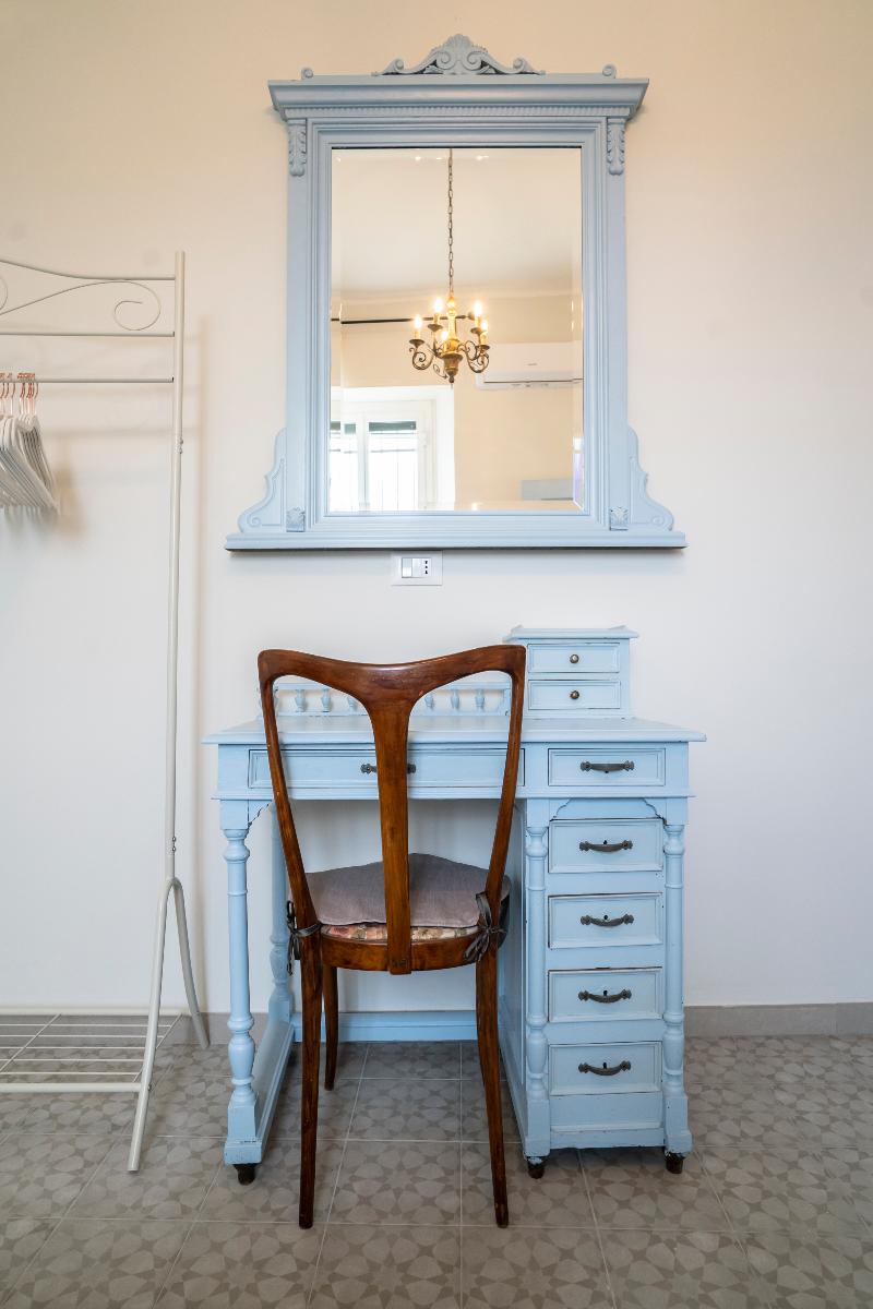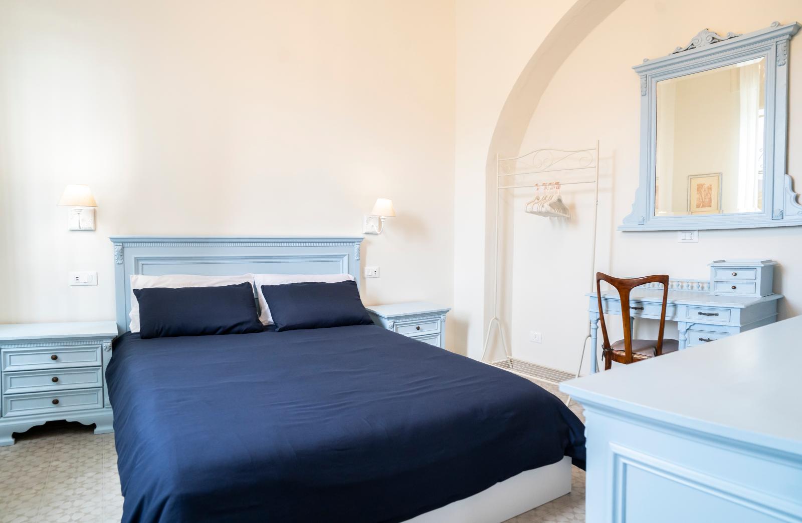 The Maestrale room welcomes you with its unique furnishings, composed of personally restored antique furniture, all in light blue tones that evoke the serenity of the sky and the sea. The environment is an enchanting haven of peace, where you can relax and let yourself be enveloped by the magic of the past, without giving up modern comfort, with air conditioning, independent heating and a Smart TV.